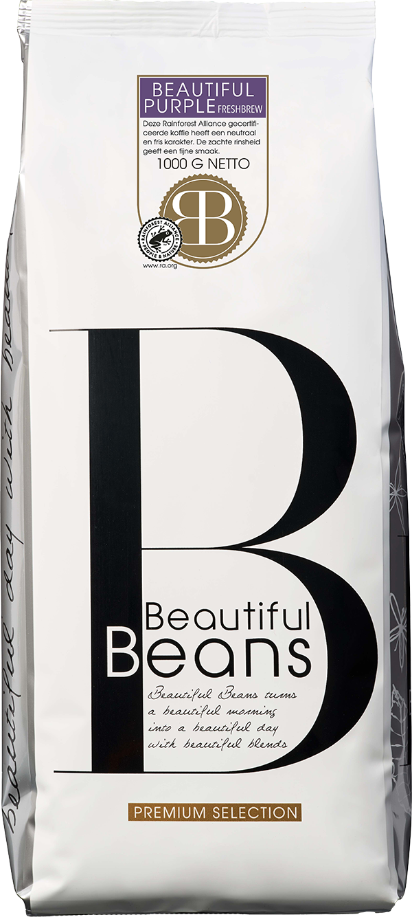 Beautiful Beans Purple (Fresh Brew) onderscheidt zich met zijn neutrale en frisse karakter. De zachte rinsheid geeft de koffie een fijne smaak. Doos à 8 zakken van 1kg.