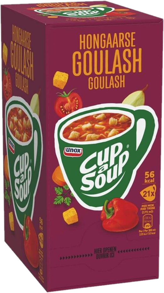 Cup-a-Soup Hongaarse Goulash: een snelle, hartige opkikker die je weer energie geeft om door te gaan! Daarnaast bevat deze Cup-a-Soup Hongaarse Goulash geen kunstmatige kleurstoffen of toegevoegde smaakversterkers. Een zakje van deze heerlijke Cup-a-Soup Hongaarse Goulash bevat 72 calorieën per mok. De Cup-a-Soup Hongaarse Goulash is eenvoudig en snel te bereiden: doe de inhoud van het zakje in jouw favoriete mok en giet er 175 ml kokend water bij. Daarna eventjes roeren, 1 minuutje wachten en klaar, eet smakelijk!