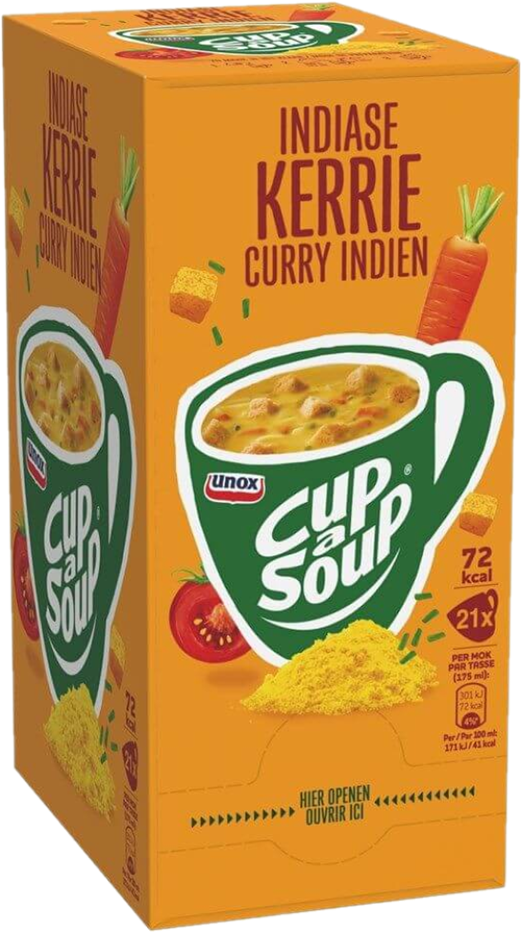 Cup-a-Soup Indiase Kerrie: een snelle, hartige opkikker die je weer energie geeft om door te gaan! Daarnaast bevat deze Cup-a-Soup Indiase Kerrie geen kunstmatige kleurstoffen of toegevoegde smaakversterkers. Een zakje van deze heerlijke Cup-a-Soup Indiase Kerrie bevat 72 calorieën per mok. De Cup-a-Soup Indiase Kerrie is eenvoudig en snel te bereiden: doe de inhoud van het zakje in jouw favoriete mok en giet er 175 ml kokend water bij. Daarna eventjes roeren, 1 minuutje wachten en klaar, eet smakelijk!