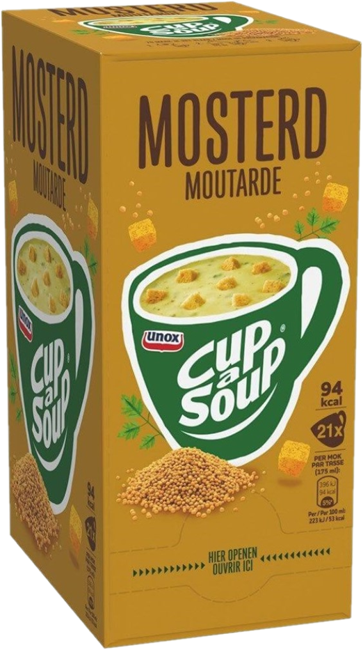 Cup-a-Soup Mosterd: een snelle, hartige opkikker die je weer energie geeft om door te gaan! Daarnaast bevat deze Cup-a-Soup Mosterd geen kunstmatige kleurstoffen, conserveermiddelen of toegevoegde smaakversterkers. Een zakje van deze heerlijke Cup-a-Soup Mosterd bevat 94 calorieën per mok. De Cup-a-Soup Mosterd is eenvoudig en snel te bereiden: doe de inhoud van het zakje in jouw favoriete mok en giet er 175 ml kokend water bij. Daarna eventjes roeren, 1 minuutje wachten en klaar, eet smakelijk!