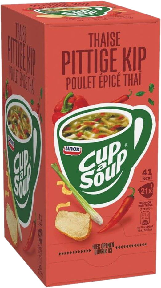 Cup-a-Soup Thaise Pittige Kip: een snelle, hartige opkikker die je weer energie geeft om door te gaan! Daarnaast bevat deze Cup-a-Soup Thaise Pittige Kip geen kunstmatige kleurstoffen, conserveermiddelen of toegevoegde smaakversterkers. Een zakje van deze heerlijke Cup-a-Soup Thaise Pittige Kip bevat 45 calorieën per mok. De Cup-a-Soup Thaise Pittige Kip is eenvoudig en snel te bereiden: doe de inhoud van het zakje in jouw favoriete mok en giet er 175 ml kokend water bij. Daarna eventjes roeren, 1 minuutje wachten en klaar, eet smakelijk!