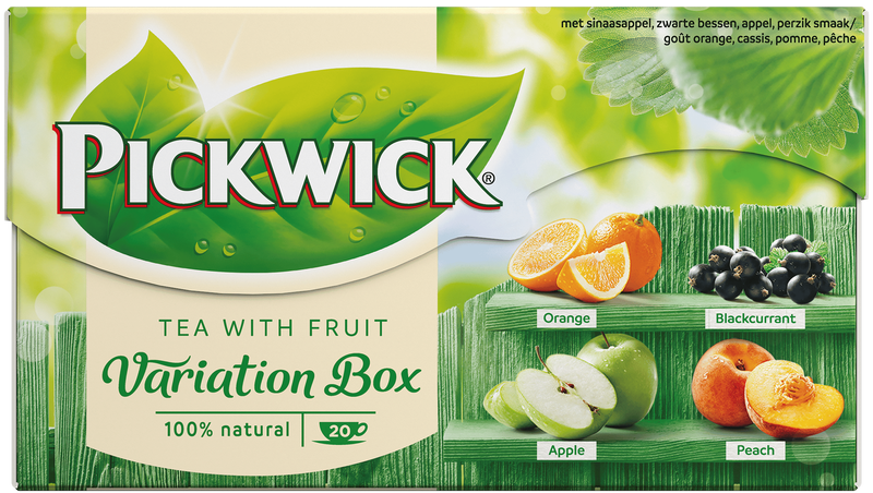In de Pickwick Fruitvariatie Groen komen de frisse en fruitige smaken van sinaasappel, zwarte bes, appel en perzik samen in één heerlijke verpakking. Deze melange biedt een perfecte balans tussen de levendige citrusfrisheid van sinaasappel, de lichte zuurheid van zwarte bes, de verfrissende smaak van appel en de zachte, zoete tonen van perzik. Het resultaat is een verkwikkende en smaakvolle thee die zowel dorstlessend als heerlijk aromatisch is. Deze Fruitvariatie Groen is ideaal voor een verfrissend moment op elk moment van de dag, of je nu op zoek bent naar een opwekkende boost in de ochtend of een ontspannend kopje in de middag. Zonder cafeïne, zodat je er op elk moment van de dag van kunt genieten!